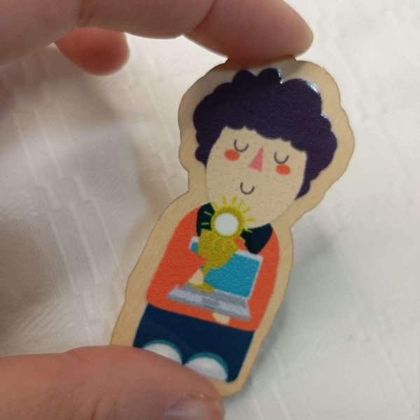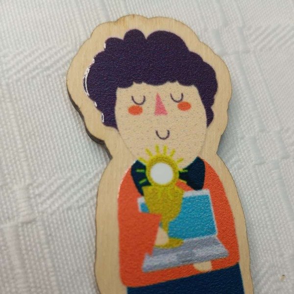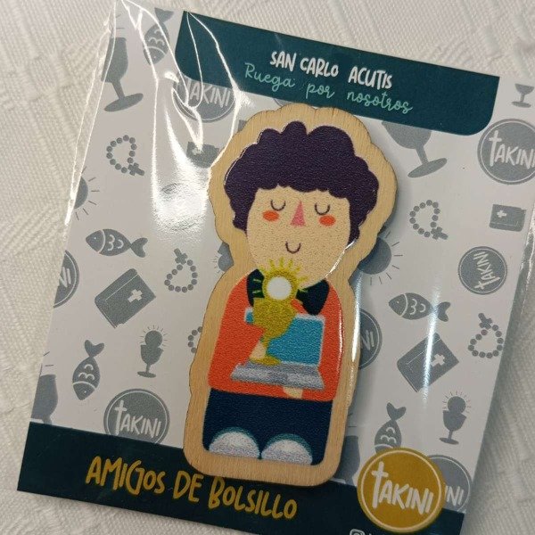 Pequeñas piezas de madera e impresa con la figura de Jesús, María o santos, pensadas para que los niños puedan llevarlas consigo en el bolsillo, la mochila o el estuche.