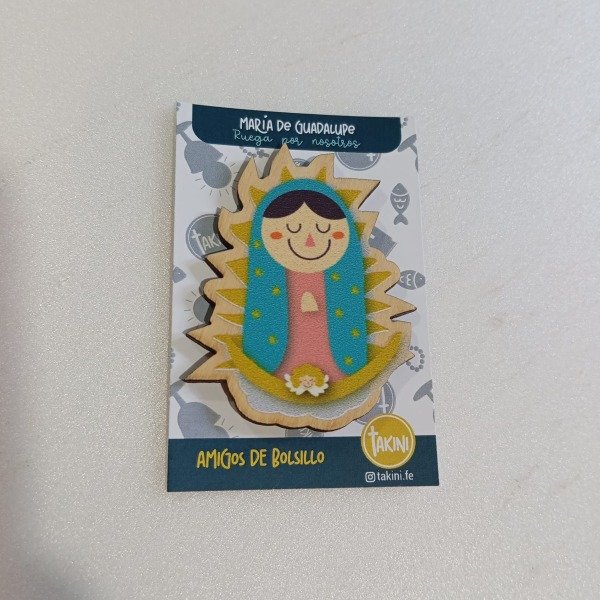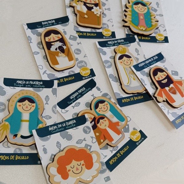 Pequeñas piezas de madera e impresa con la figura de Jesús, María o santos, pensadas para que los niños puedan llevarlas consigo en el bolsillo, la mochila o el estuche.