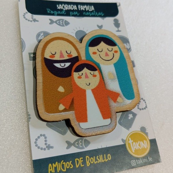 Pequeñas piezas de madera e impresa con la figura de Jesús, María o santos, pensadas para que los niños puedan llevarlas consigo en el bolsillo, la mochila o el estuche.