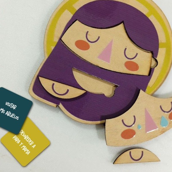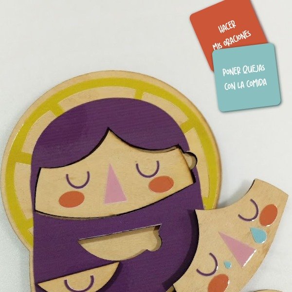 Juego de madera de guatambú de fácil encastre, contiene tarjetas que invitan a una reflexión sobre las emociones y acciones, permitiendo que los pequeños desarrollen motricidad, cultiven la empatía y vivan momentos de diálogo y aprendizaje en familia. Mientras juegan, descubren a Dios desde pequeños, sintiéndolo cerca en cada enseñanza. Ideal para fortalecer valores, compartir en casa y vivir la fe de una manera didáctica y amorosa