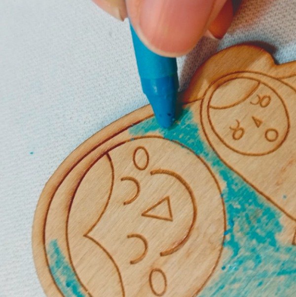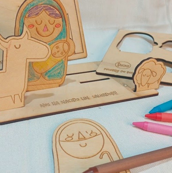 Incluye 6 piezas de madera con un diseño grabado de la Natividad y un juego de 12 crayones.